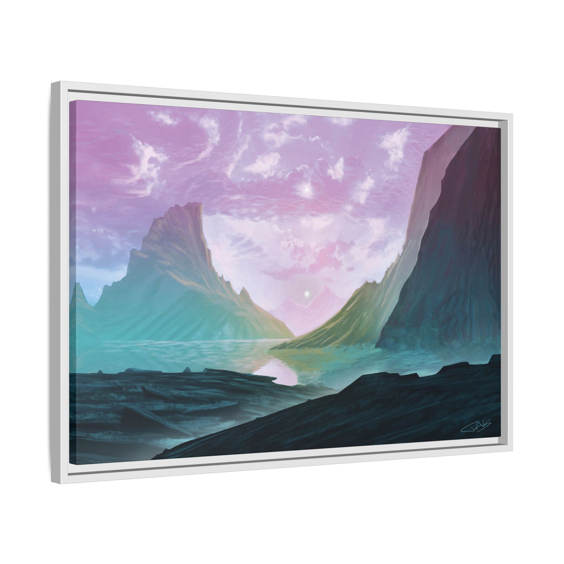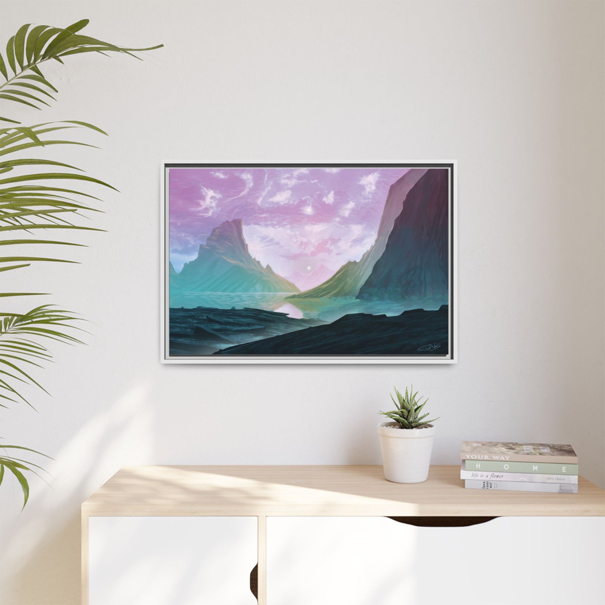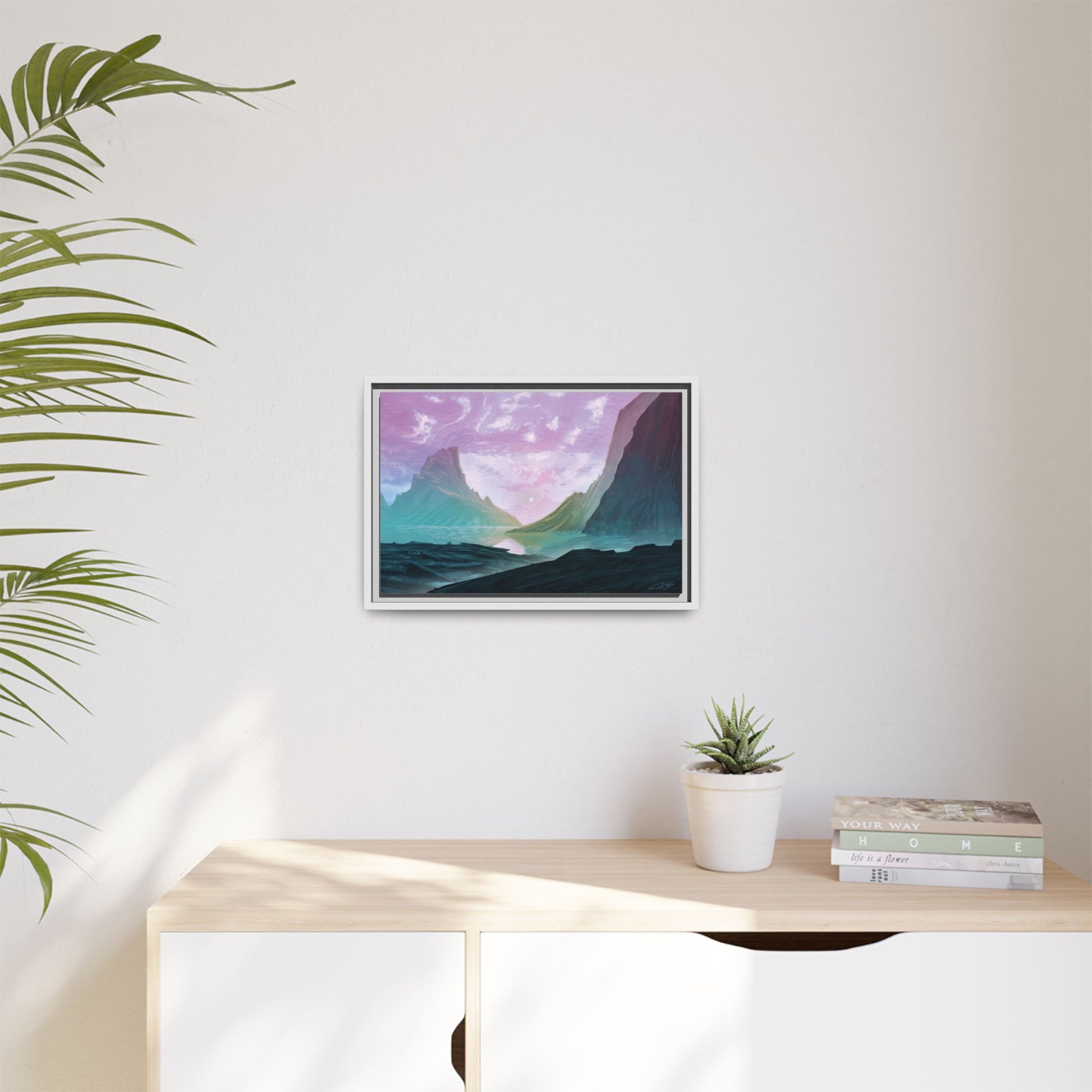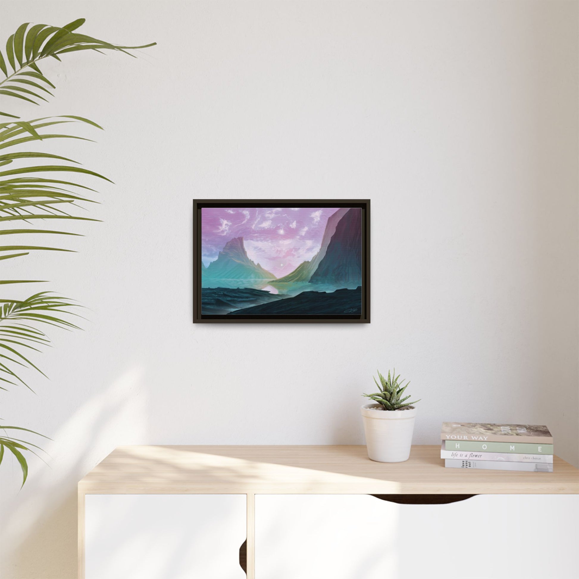 A framed matte canvas that pulls you into a soft, otherworldly landscape—muted teals and blush pinks blending into distant peaks and a gentle, reflective river. The low-sheen finish keeps glare down and mood up, so the scene reads like a quiet memory on your wall. Hung in a reading nook or over a bedside, it invites slow moments: morning coffee, sketching, or evening unwinding. The slender black frame and sawtooth hanger give a clean, modern edge that complements both minimalist and cozy interiors. This print settles into spaces where calm, curiosity, and subtle color matter.