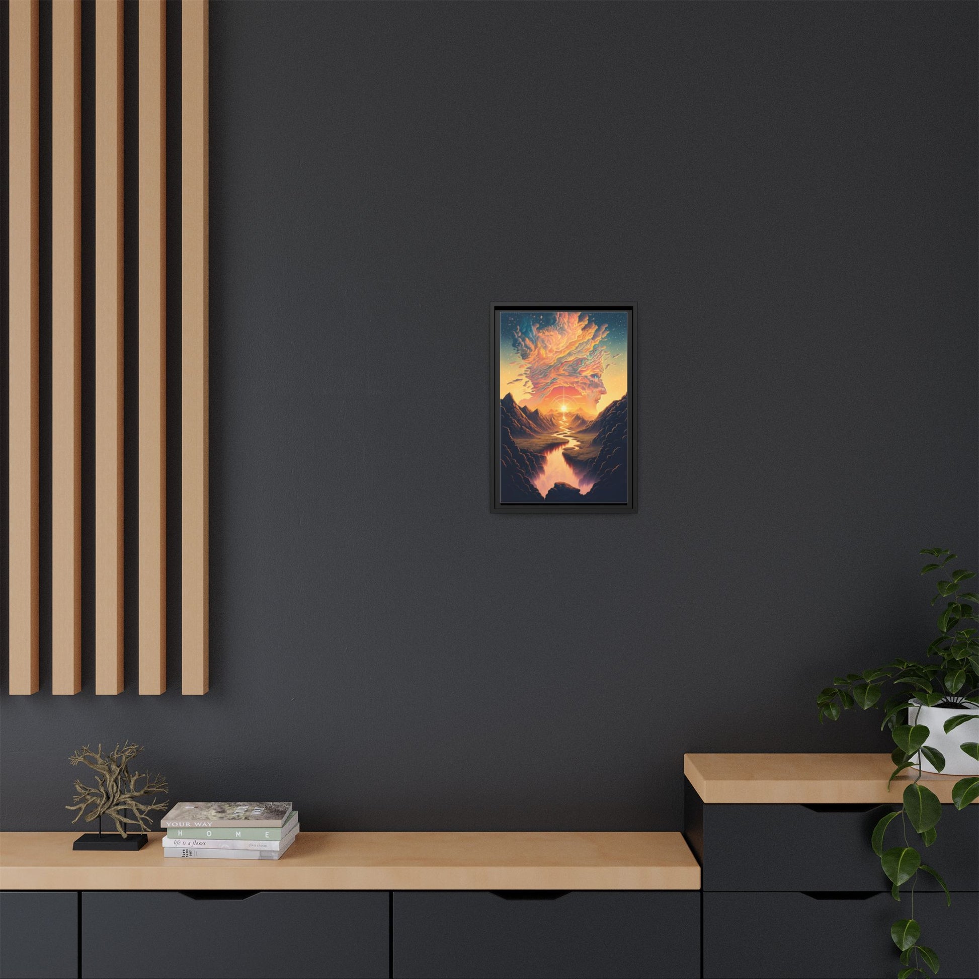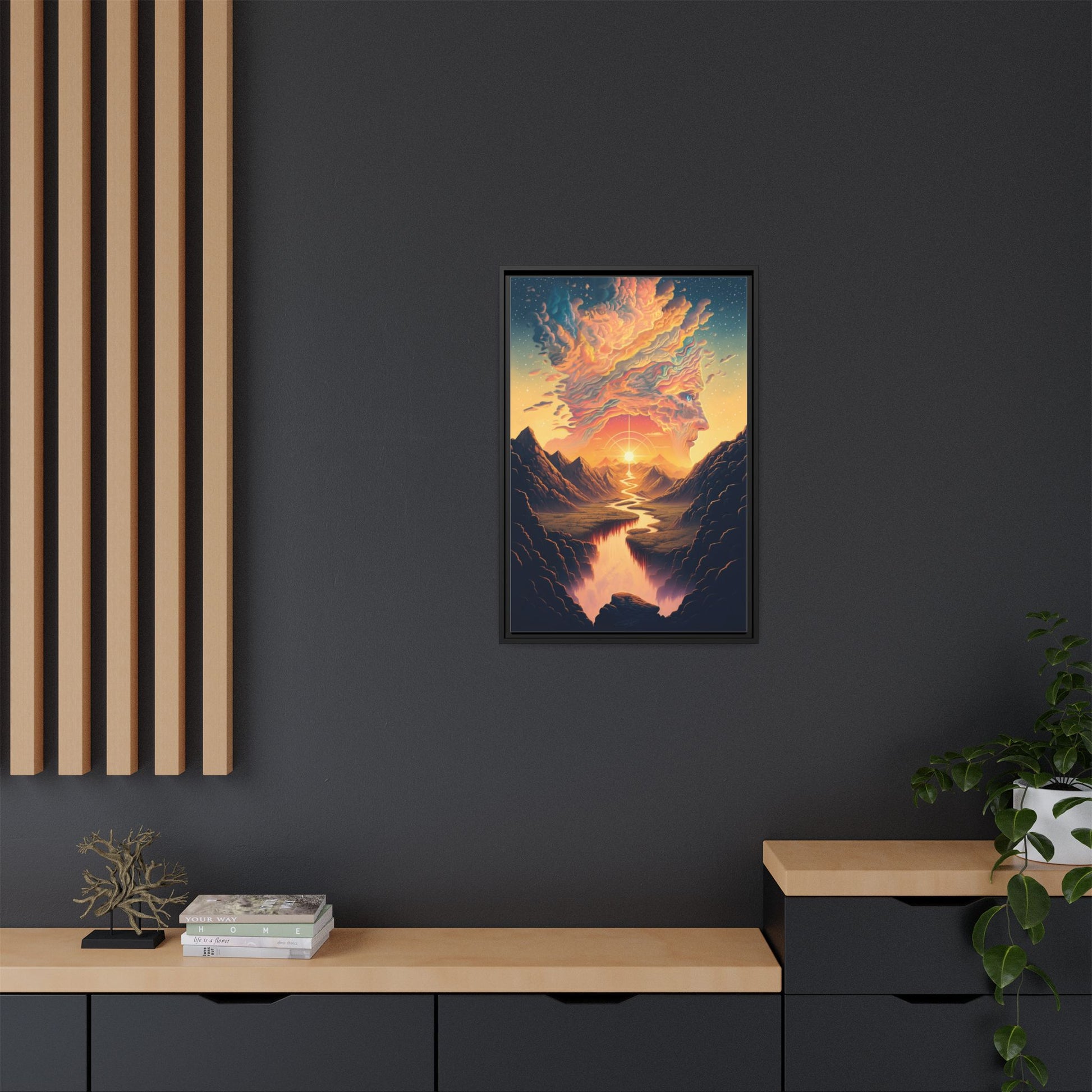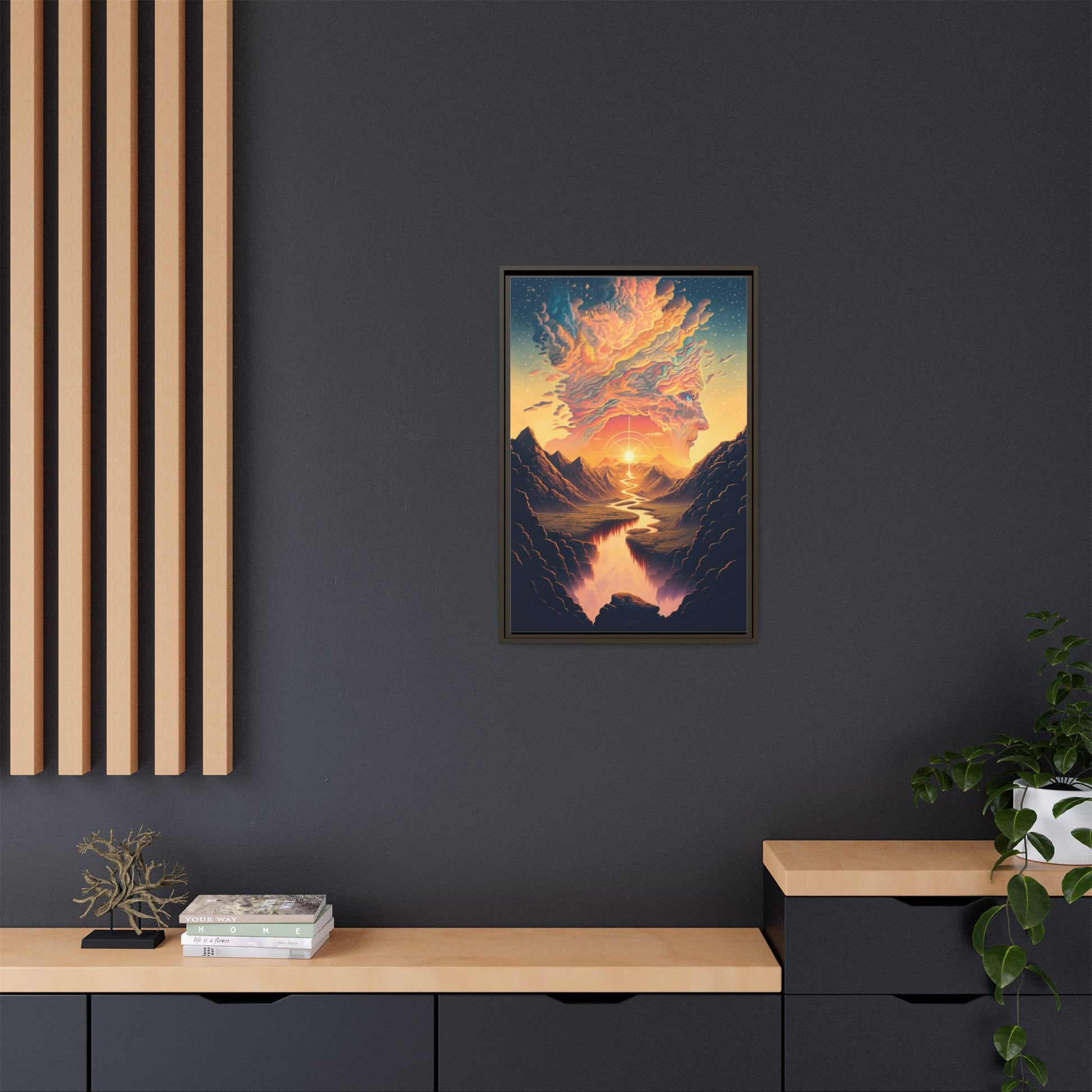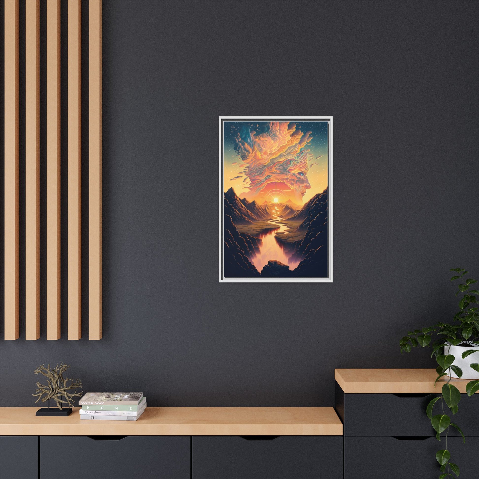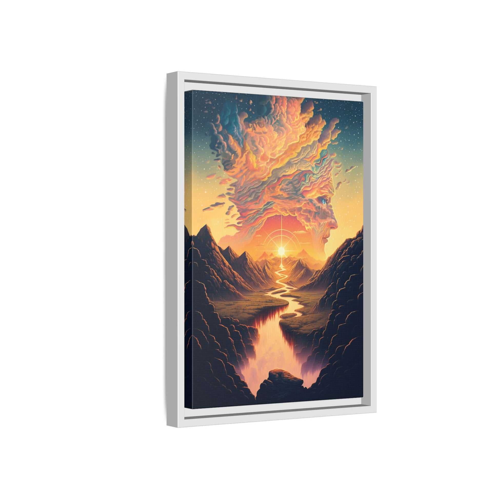 This matte canvas framed print brings a dreamlike landscape into your home with painterly color and soulful composition. Warm golden light spills from a radiant sun, tracing a winding river through shadowed mountains and melting into a cloud-formed visage above — a quiet, cinematic moment that invites contemplation. The smooth, non-reflective finish and slim pine frame keep the focus on the artwork, while vivid, lasting inks preserve the fine gradients and rich hues. Hang it in a living room, hallway, or studio to create a calm, inspired corner where evenings feel softer and conversations run deeper.