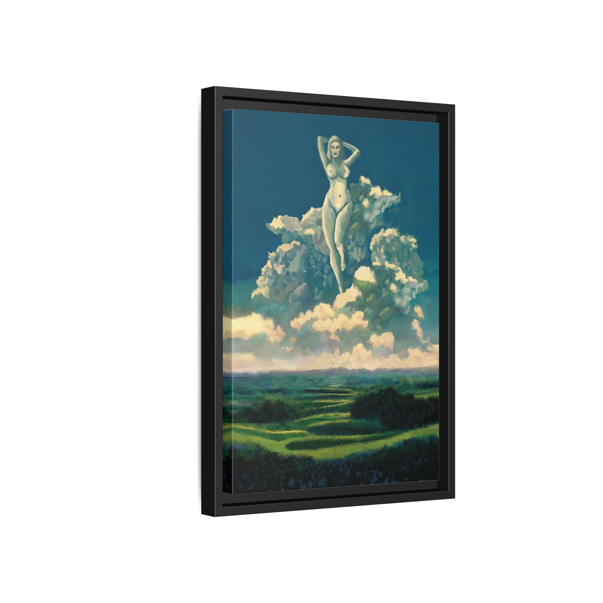 A matte, framed canvas that brings dreamy surrealism into your space. Deep teal skies and sculpted clouds cradle a luminous figure rising above a winding emerald landscape — the scene feels like a quiet memory you can walk into. The fine-grain canvas surface mutes glare while preserving rich, painterly detail. A slim pine frame and professional stretch give the piece a gallery-ready presence, whether it hangs above a sofa or anchors a reading nook. It’s the kind of artwork that rewards slow looks and sparks late-night conversations about memory, myth, and place.