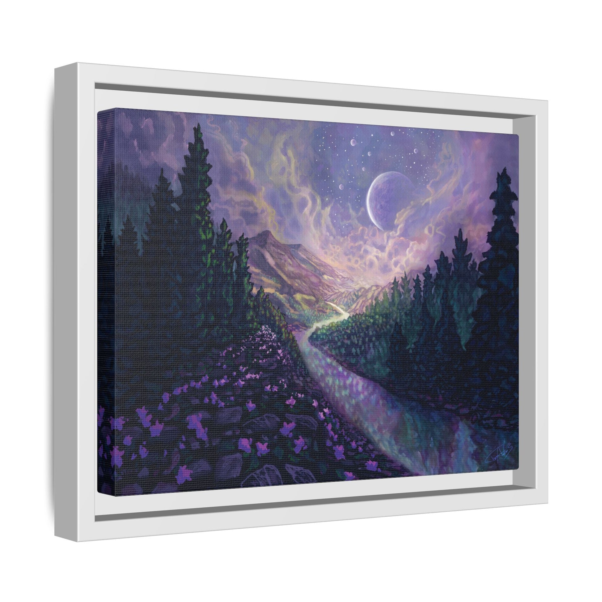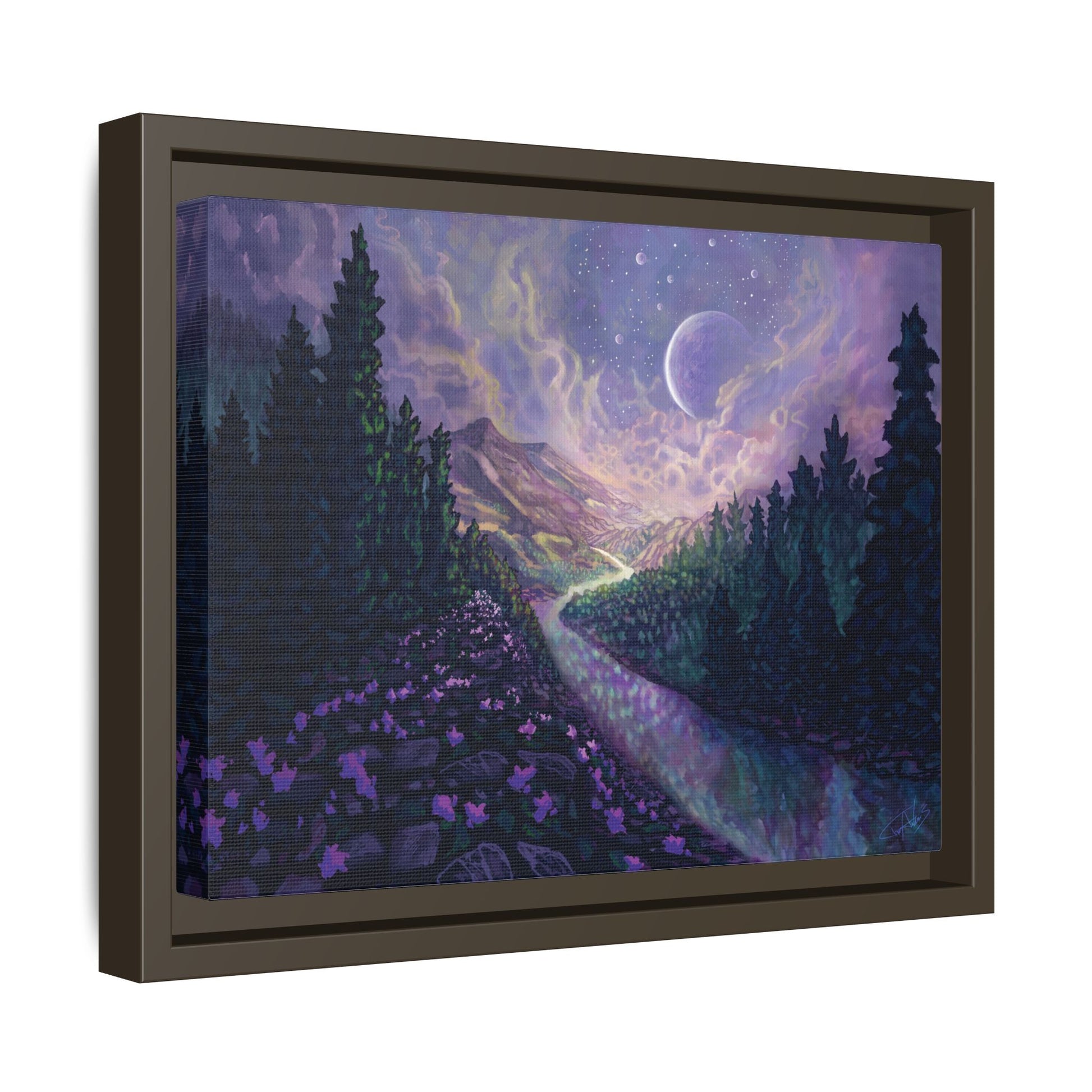 Hand-stretched matte canvas framed in a clean pine surround — this print brings a quiet, otherworldly nightscape into any room. Deep purples and soft moonlight glow across a winding river and wildflower-strewn valley, drawing the eye inward. The satin-matte surface minimizes glare so colors read true from every angle, while the solid pine frame gives the piece presence on the wall without stealing the scene. It hangs ready with sawtooth hardware and arrives protected for easy installation. Place it above a reading nook, over a mantel, or in a dim hallway to create a slow, contemplative moment in your home.